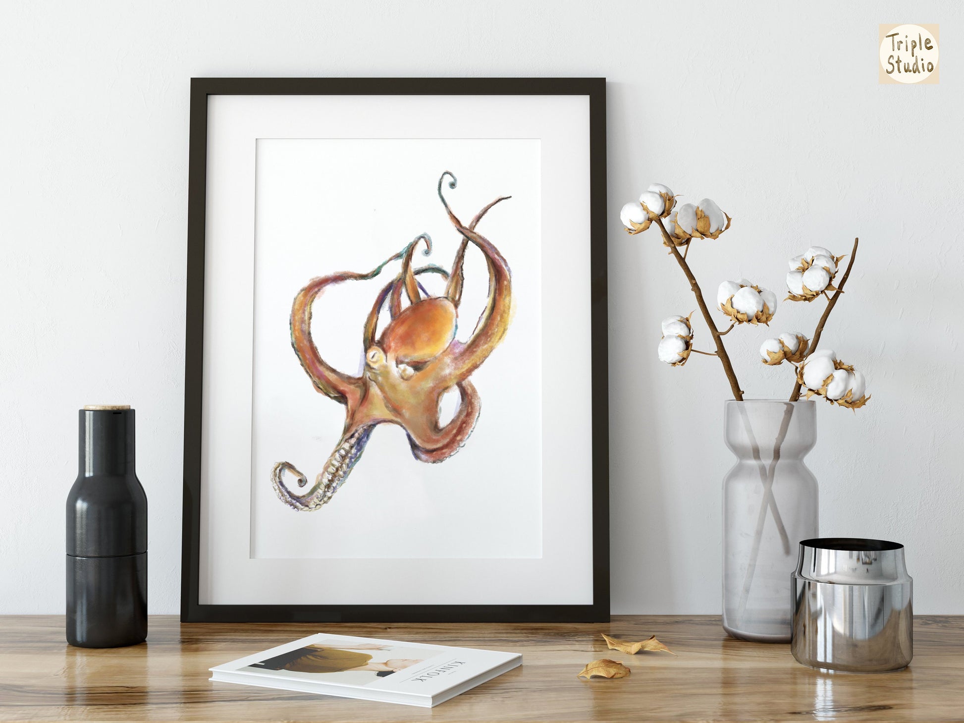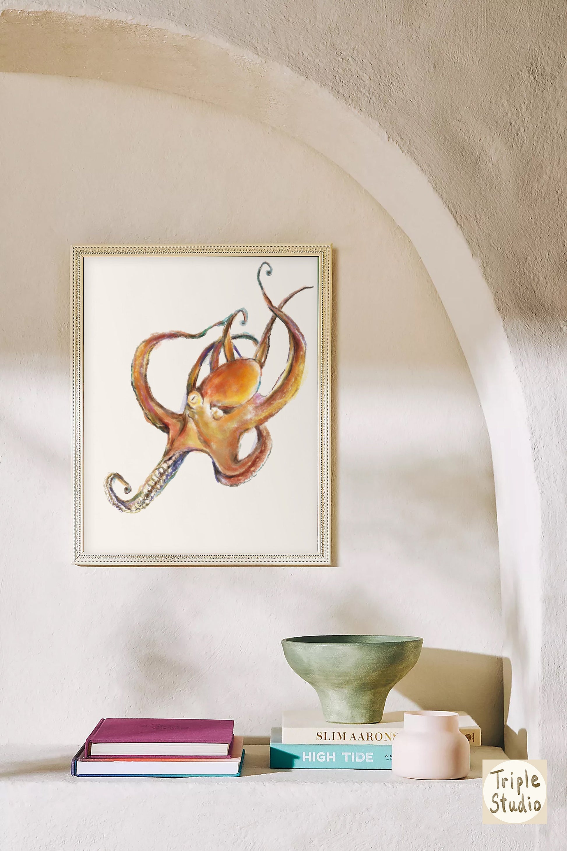 Vibrant Octopus Watercolor Art - Original Minimalistic Colorful Ocean Marine Animal Wall Decor, Tropical Wall Painting, Signed by Artist -