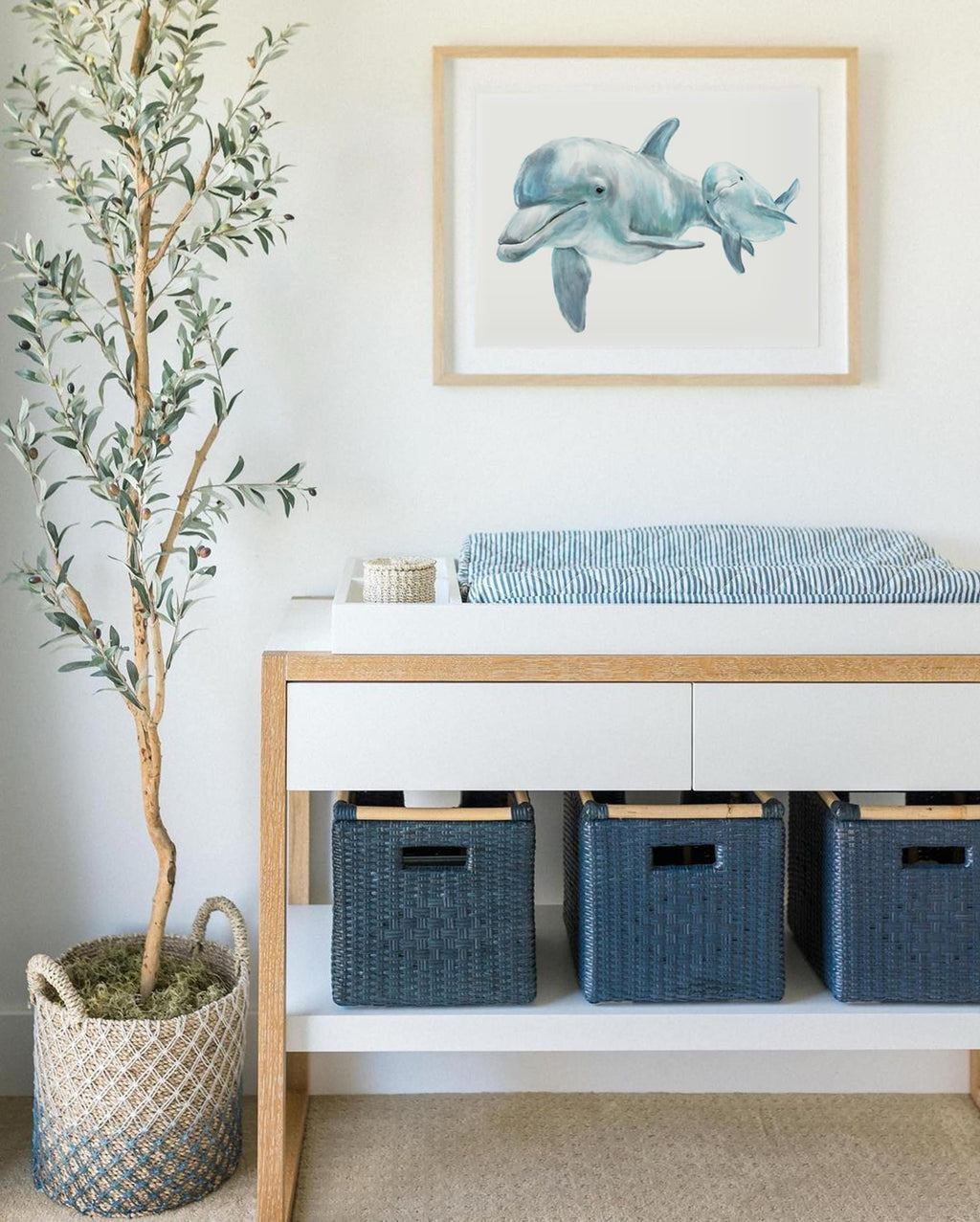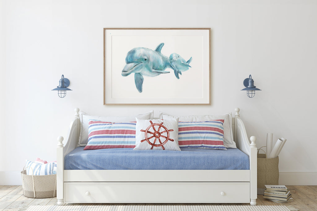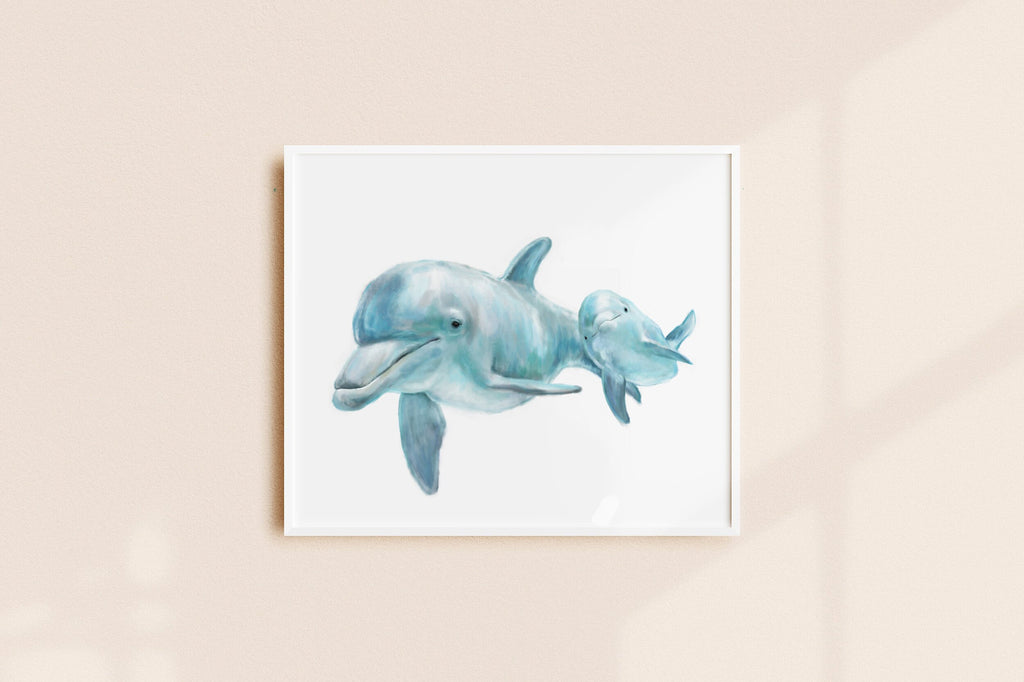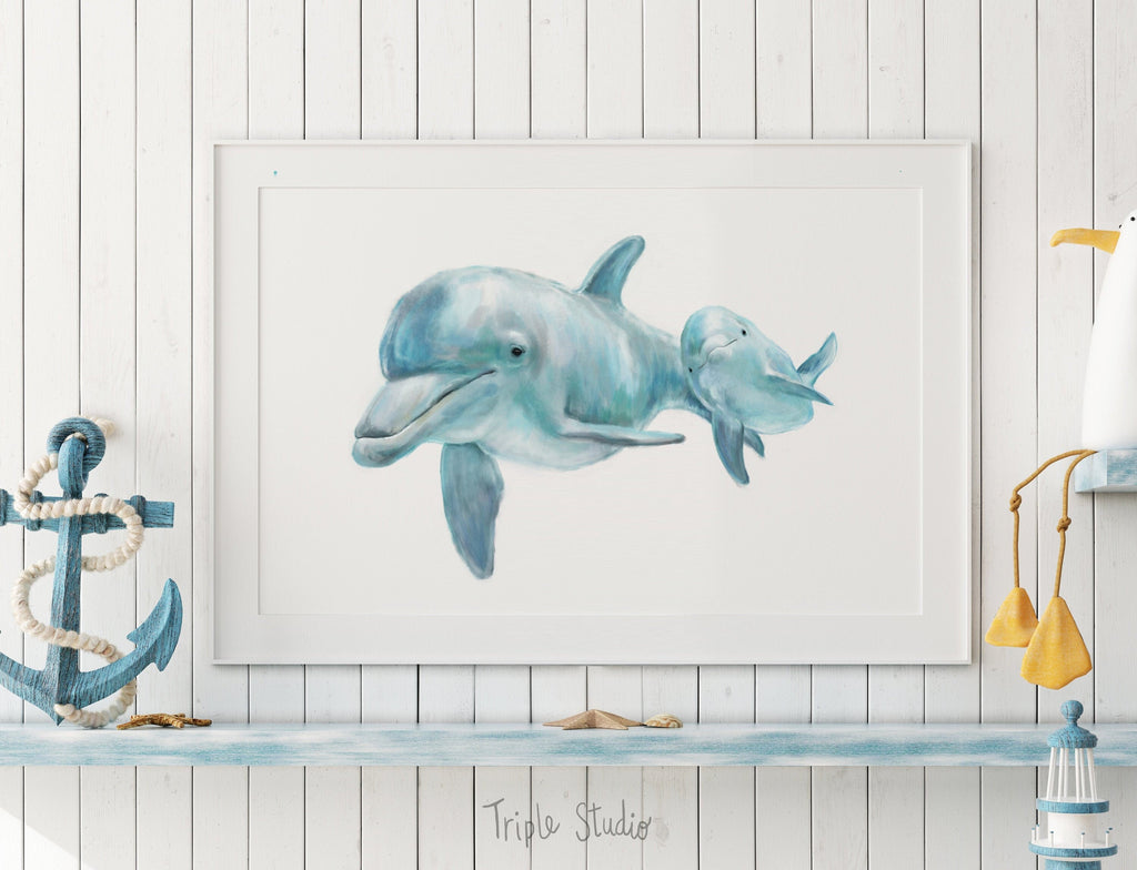 Dive into the enchanting depths of the sea with my watercolor dolphin painting. This ocean wall art stands out in vibrant hues of blue and silver, making it a nice addition to a nautical print set. Dive into the enchanting depths of the sea with our Baby Dolphin and Mom Ocean Art Print. This captivating artwork beautifully portrays the tender bond between a playful baby dolphin and its nurturing mother.